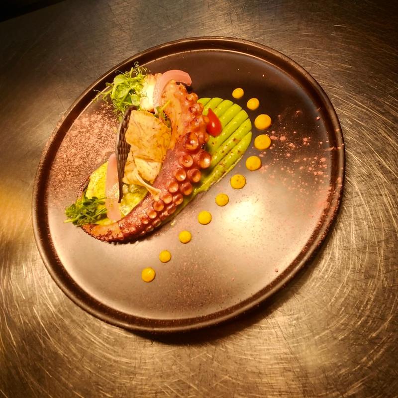 Poached Octopus, Pea Puree Wasabi, Beet Powder• Wine suggestion: Fleur de Prairie - Rose