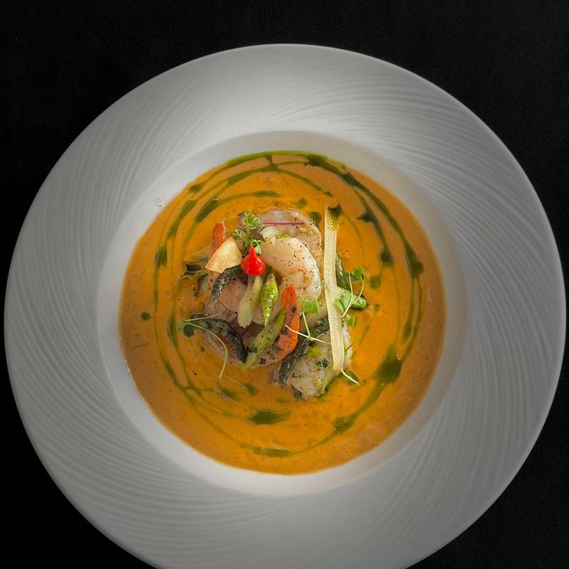 Red Curry, Sesame Seed Oil, Coconut Milk, Shrimp Poached, Herb oil • Wine suggestion: Saint Suplice, Sauvignon Blanc